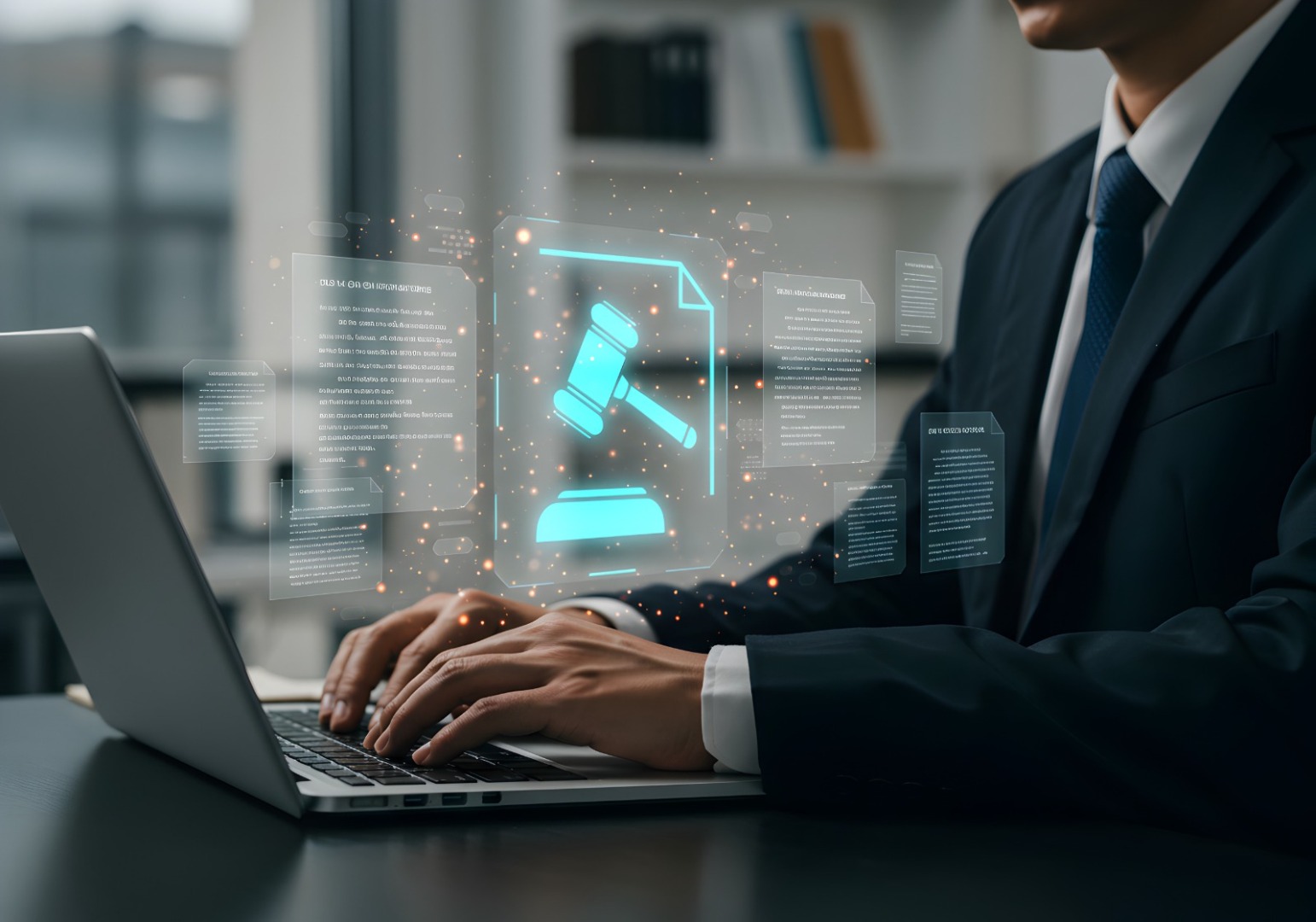 Descrição da imagem: Representação de advogado acessando serviços digitais. Um homem usa o computador, há uma projeção digital com o ícone de martelo de juiz.