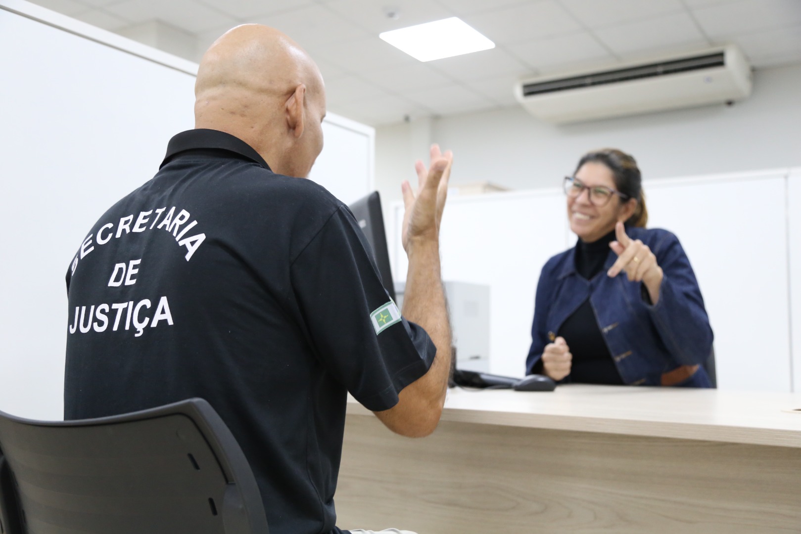 Descrição da imagem: O segurado Zaliar de Jesus é atendido pela gerente Marilza Alencar. Sentados de frente um para o outro, eles se comunicam em Libras. Foto: Rafael Carvalho/ Ascom.
