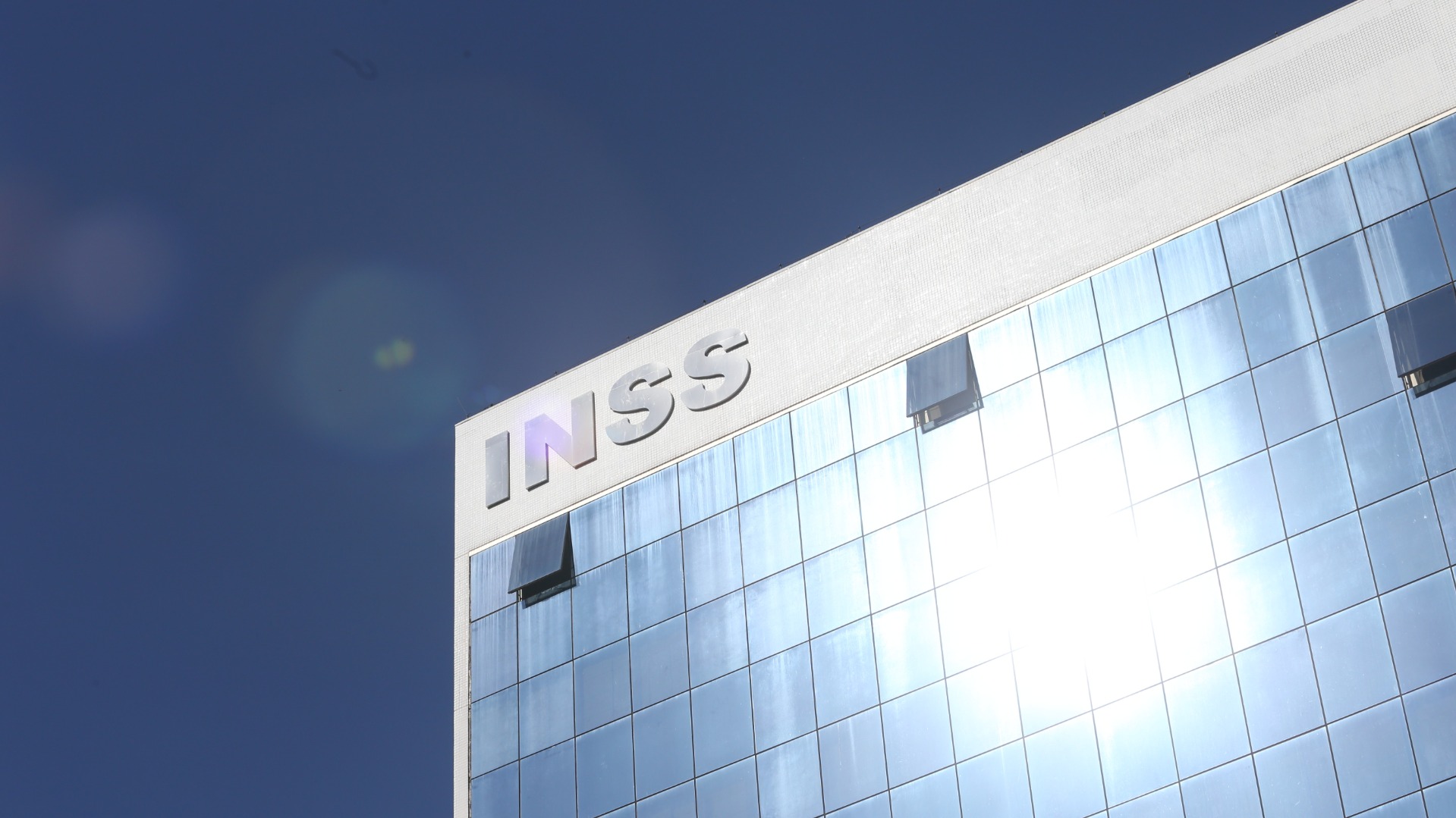 Imagem do edifício da Direção Central do INSS, com reflexo do sol nas janelas espelhadas.