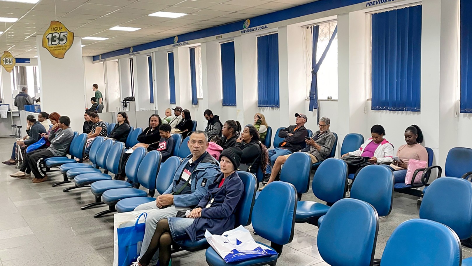 Descrição da imagem: Prédio alto e moderno, com fachada de vidro e linhas elegantes, exibe as inscrições “INSS” e “Previdência Social” em destaque. Na frente, há palmeiras e gramado bem cuidado. Ao fundo, aparecem outros edifícios e o céu azul claro.