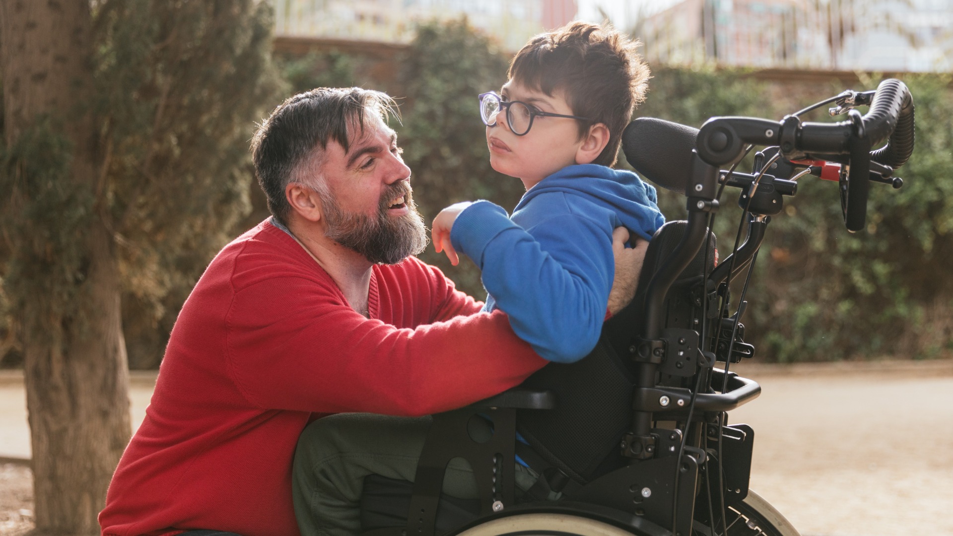 Loving father playing and enjoying time with his son with disability in a wheelchair. Parenthood, childhood and disabled people concept.