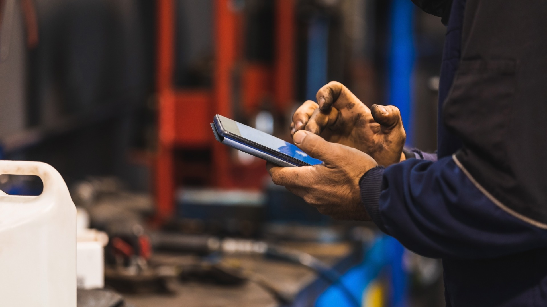 Mechanic using cell phone in the workshop. Hands full of grease. Technology concept.