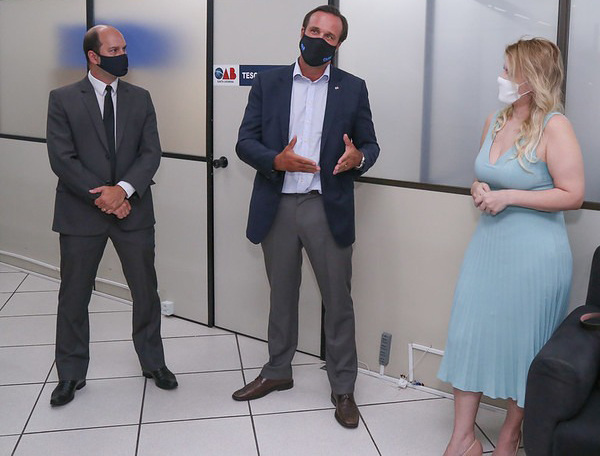 O presidente da OAB/SC, Rafael Horn, conversa com o gerente-executivo Felipe Bordin e a conselheira Gisele Kravchychyn