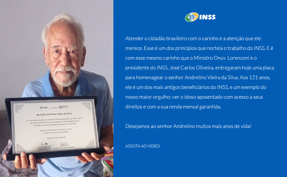 Atender o cidadão brasileiro com o carinho e a atenção que ele merece. Esse é um dos princípios que norteia o trabalho do INSS. E é com esse mesmo carinho que o ministro do Trabalho e Previdência, Onyx Lorenzoni, e o presidente do INSS, José Carlos Oliveira, entregaram hoje (7) uma placa para homenagear o senhor Andrelino Vieira da Silva. Aos 121 anos, ele é um dos mais antigos beneficiários do INSS e ficou conhecido recentemente nos noticiários pois decidiu comemorar o seu aniversário de forma um tanto inusitada: um bolo com os dizeres “terror do INSS”.