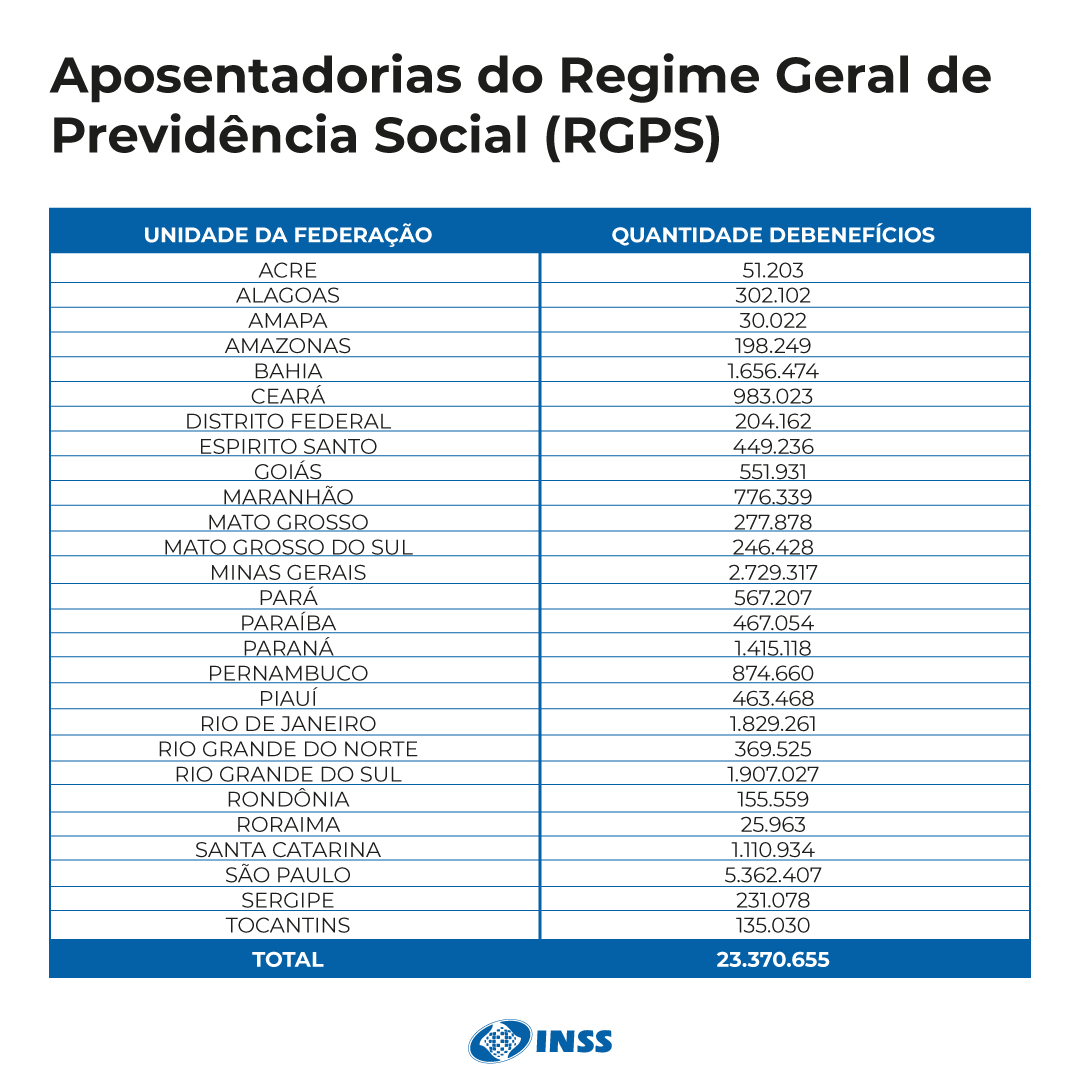 Atualmente, 23.370.655 pessoas são aposentadas pelo Regime Geral de Previdência Social (RGPS). O estado com maior contingente é São Paulo, com 5.362.407; seguido por Minas Gerais (2.729.317), Rio Grade do Sul (1.907.027) e Rio de Janeiro, com 1.829.261. Confira na tabela abaixo o número de aposentados por Unidade da Federação (UF).