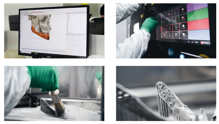 Após o projeto 3D, o implante customizado é impresso em titânio e retirado da máquina.