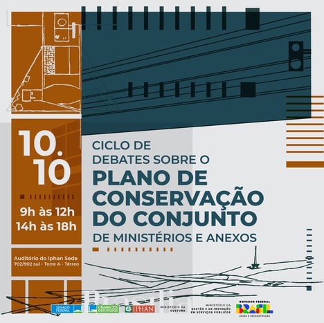 O Instituto do Patrimônio Histórico e Artístico Nacional promove, nesta terça-feira (10/10), o terceiro e último encontro do Ciclo de Debates: Plano de Conservação do Conjunto de Ministérios e Anexos, no auditório da sede do Iphan, em Brasília, de 9h às 18h. Na ocasião, a superintendência do Iphan no Distrito Federal entregará um manual orientativo que servirá de base para os profissionais envolvidos na gestão e conservação dos edifícios da Esplanada.
