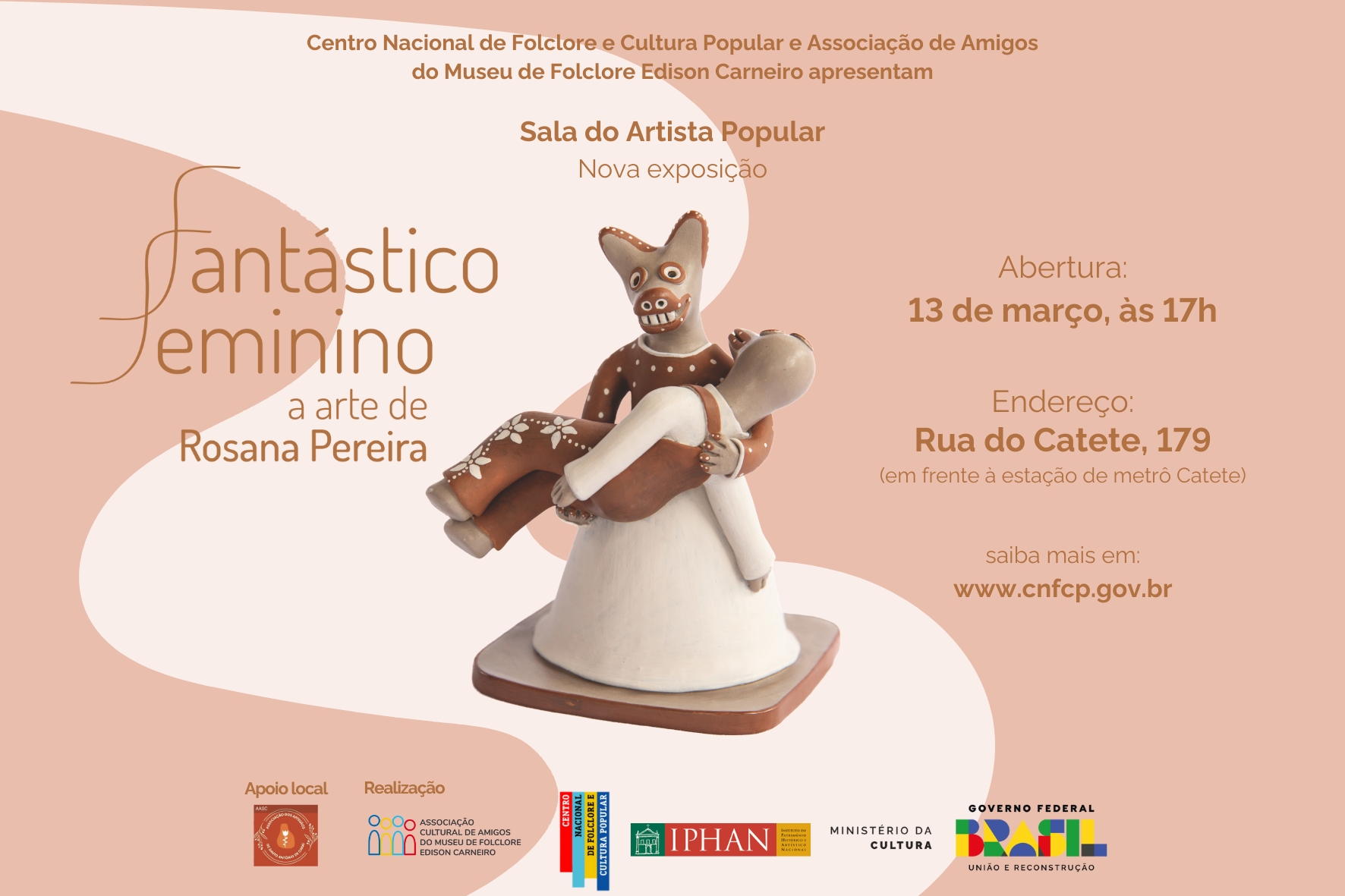 O Centro Nacional de Folclore e Cultura Popular (CNFCP), unidade especial do Instituto do Patrimônio Histórico e Artístico Nacional (Iphan) no Rio de Janeiro, inaugura, no próximo dia 13 de março, às 17h, a primeira exposição do calendário do Programa Sala do Artista Popular (SAP) em 2025. A mostra Fantástico Feminino: a Arte de Rosana Pereira, formada por obras em cerâmica que fundem gente e bicho em cenas corriqueiras da vida real, sempre com bom humor e criatividade, terá entrada grátis até 18 de maio.