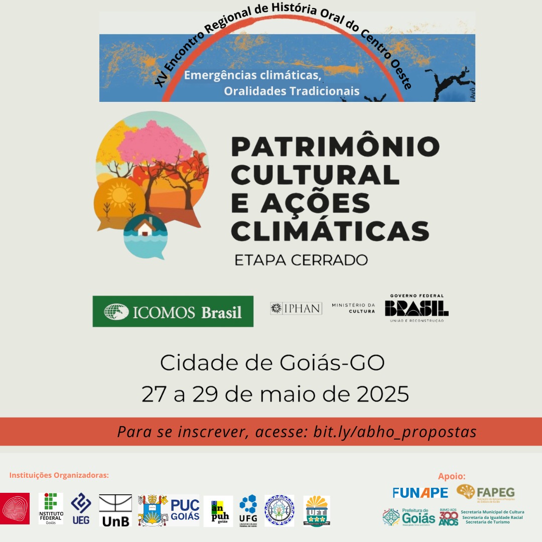 O Departamento de Articulação, Fomento e Educação do Instituto do Patrimônio Histórico e Artístico Nacional (Dafe/Iphan), em parceria com o Comitê de Mudanças Climáticas e Patrimônio do Conselho Internacional de Monumentos e Sítios (ICOMOS Brasil), realizará mais uma etapa do Ciclo de Diálogos sobre o Patrimônio Cultural e Ações Climáticas, dessa vez, no Campus da Universidade Estadual de Goiás na cidade de Goiás (GO), entre os dias 27 a 29 de maio. A etapa do bioma Cerrado acontecerá durante o XV Encontro Regional de História Oral do Centro Oeste, e os interessados podem se inscrever clicando aqui.