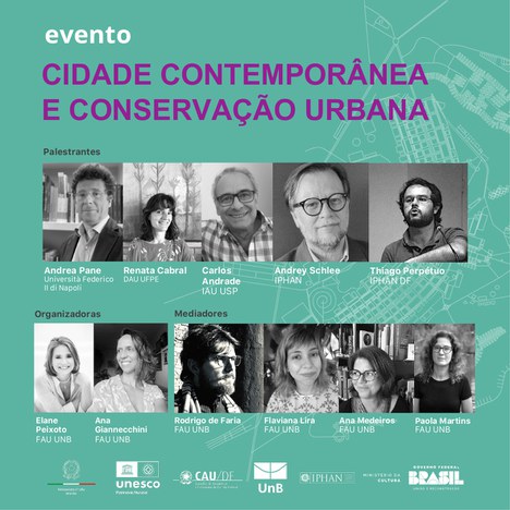 O evento “Cidade Contemporânea e conservação urbana” será realizado nos dias 10 a 13 de julho, no auditório da Faculdade de Arquitetura e Urbanismo da Universidade de Brasília (UnB). A programação é aberta ao público e conta com o apoio do Instituto do Patrimônio Histórico e Artístico Nacional (Iphan), no âmbito do projeto de cooperação técnica internacional com a Organização das Nações Unidas para a Educação, a Ciência e Cultura (Unesco) Brasil.