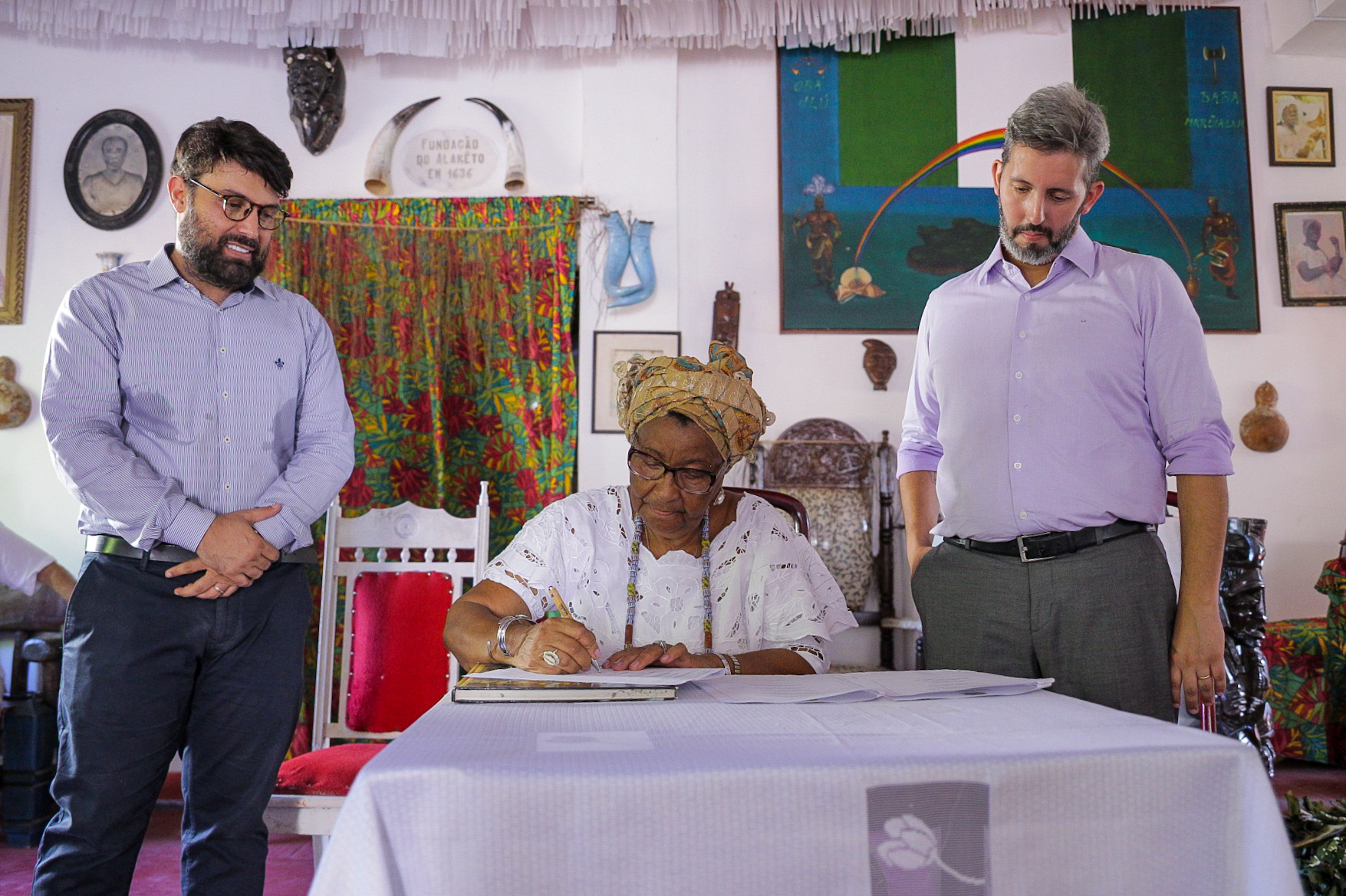 Após a assinatura da ordem de serviço para a empresa de engenharia responsável pelas obras, representantes do terreiro receberam na tarde desta terça-feira (18/03) uma visita do presidente do Iphan, Leandro Grass, e do superintendente do órgão na Bahia, Hermano Guanais.