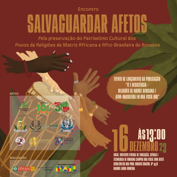 O Instituto do Patrimônio Histórico e Artístico Nacional (Iphan) realiza, no dia 16 de dezembro, o Encontro Salvaguardar Afetos: pela preservação do Patrimônio Cultural dos Povos de Religiões de Matriz Africana e Afro-brasileira de Roraima. O evento tem início às 13h, no campus Boa Vista Zona Oeste do Instituto Federal de Educação, Ciência e Tecnologia de Roraima (IFRR) , em Boa Vista (RR), e é voltado para os povos de terreiros e comunidades tradicionais.