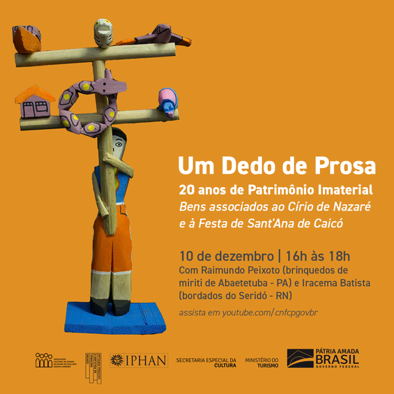 Dentro da temática dos 20 anos da Política de Patrimônio Imaterial, o evento online desta vez reúne detentores de bens associados a manifestações registradas como Patrimônio Cultural: Raimundo Peixoto, que é artesão de brinquedos de miriti em Abaetetuba (PA), prática associada ao Círio de Nazaré; e Iracema Batista, bordadeira de Caicó, atividade que é parte da Festa de Sant’Ana de Caicó.