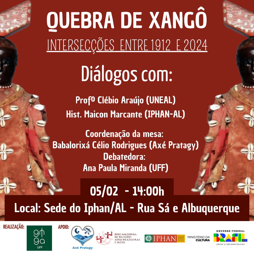 Sob organização do museu Axé Pratagy e do grupo de pesquisa Ginga-UFF, o debate terá um olhar especial para a memória dos ancestrais e suas estratégias de resistência após um dos maiores atos de violência contra religiões de matriz africana já vistos no País, conhecido como a Quebra de Xangô. Além disso, será abordado o processo de instrução de tombamento pelo Iphan do acervo Perseverança - composto pelos artigos sagrados que resistiram àqueles atos de destruição - como Patrimônio Cultural Brasileiro.