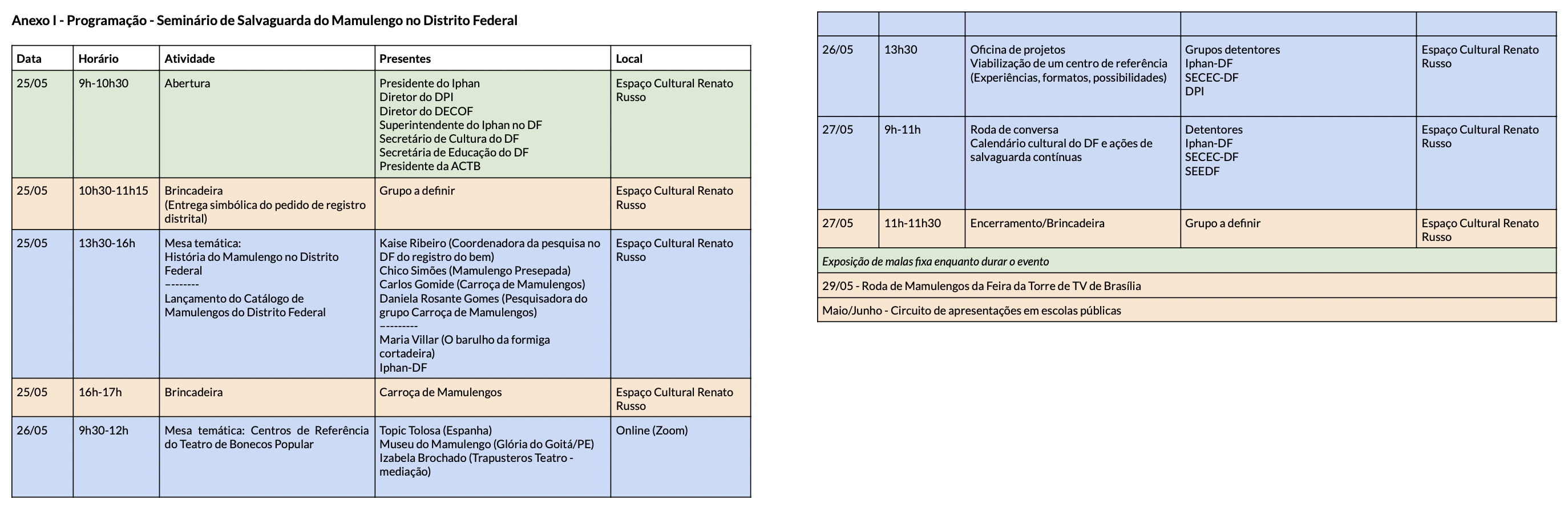 A programação incluirá mesas temáticas, brincadeiras com os bonecos, oficinas e uma roda de conversa. Durante o encontro, será lançado o Catálogo de Mamulengos do Distrito Federal, elaborado com o apoio do Iphan. Além dos detentores, participarão técnicos do Instituto e autoridades do GDF. “Além de proteger os bens culturais, o Iphan tem o compromisso de aproximá-los da população. Eventos como esse são grandes oportunidades para cumprir essa missão”, afirma a presidente do Iphan, Larissa Peixoto.