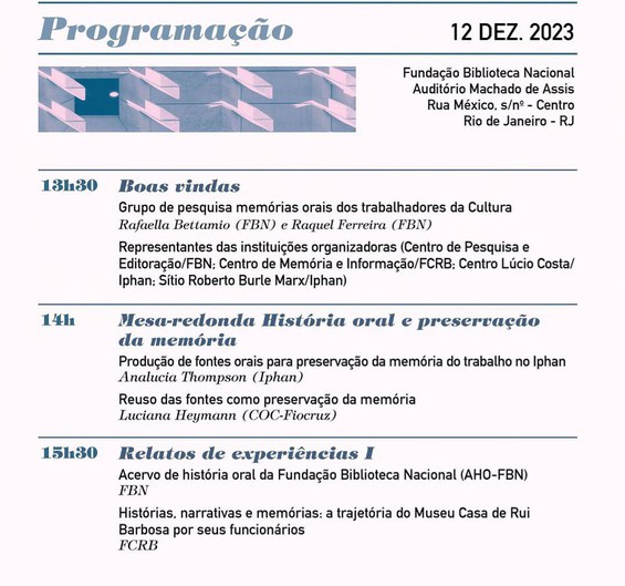 Além da história oficial de qualquer empresa ou organização, existe uma outra, cuja memória não é registrada em documentos institucionais e que só pode ser resgatada através de relatos de quem viveu, testemunhou e foi impactado pelas trajetórias que a entidade seguiu; esta é a memória oral. A pesquisa desse tipo de material possui abordagem e métodos particulares, e é isso que, nos dias 12 e 13 de dezembro, será discutido por pesquisadores do Instituto do Patrimônio Histórico e Artístico Nacional (Iphan), da Fundação Biblioteca Nacional (FBN) e da Casa de Rui Barbosa que integram o Grupo de Pesquisa Memórias Orais dos Trabalhadores da Cultura.