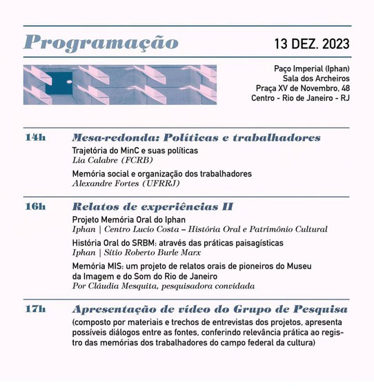 Joseane Brandão, pesquisadora do CLC/Iphan, complementa: “O queremos é trazer a diversidade das histórias e cotidiano dos trabalhadores da Cultura. Inicialmente dessas vinculadas [ao Ministério da Cultura], das quais fazemos parte, mas há o desejo de buscar interessados em outras vinculadas, que também participem dessa discussão que pensa história oral, trabalho e Cultura.”