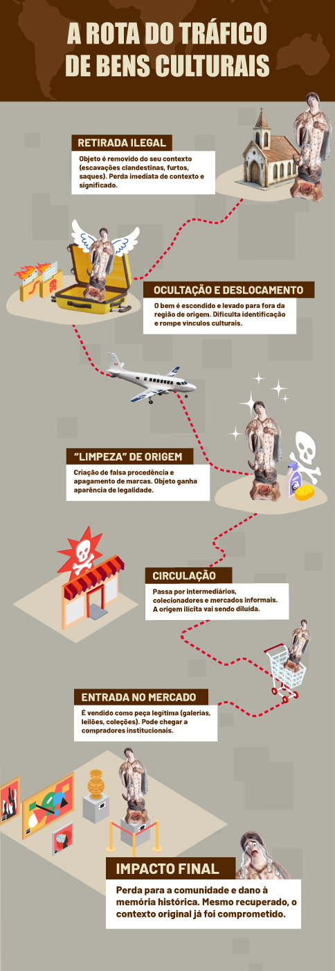 Com essa fachada, o bem entra em uma cadeia de intermediários: comerciantes informais, antiquários, galerias e colecionadores circulando por diferentes países em várias etapas para diluir responsabilidades. No final da rota, ele pode aparecer em leilões, exposições ou acervos privados, adquirido como obra de arte legítima. O resultado é sempre o mesmo: lucro para poucos e perda irreversível para a comunidade que detinha aquele patrimônio.
