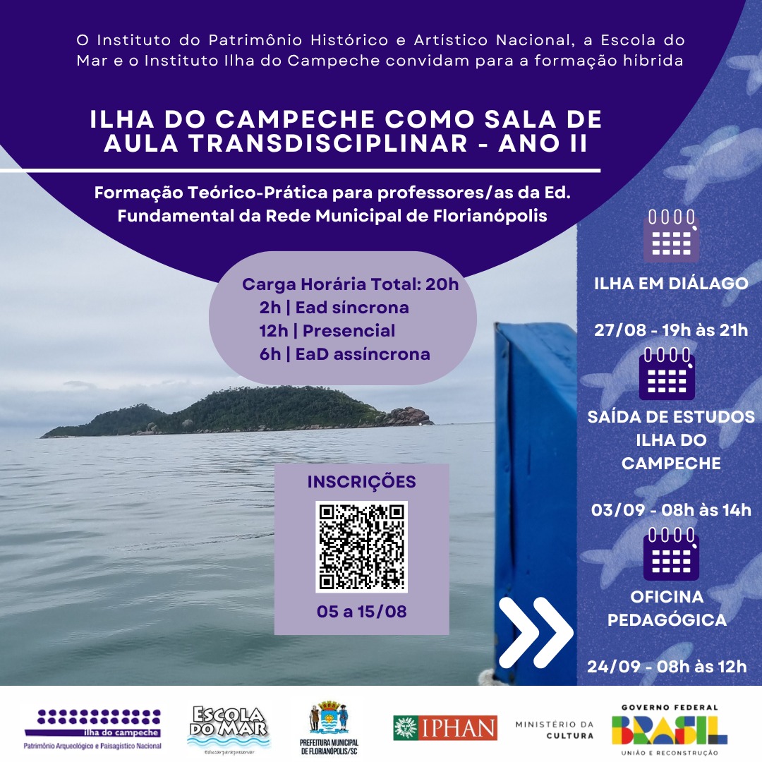 A Ilha do Campeche (SC) receberá, no dia 3 de setembro, professores e professoras da rede municipal de educação participantes do curso Ilha do Campeche como Sala de Aula Transdisciplinar, promovido pelo Instituto do Patrimônio Histórico e Artístico Nacional (Iphan), em parceria com o Instituto Ilha do Campeche (IIC) e a Escola do Mar/Secretaria Municipal de Educação de Florianópolis. Serão 50 vagas disponíveis, e os interessados devem realizar inscrição por meio de formulário online até o dia 15 de agosto.