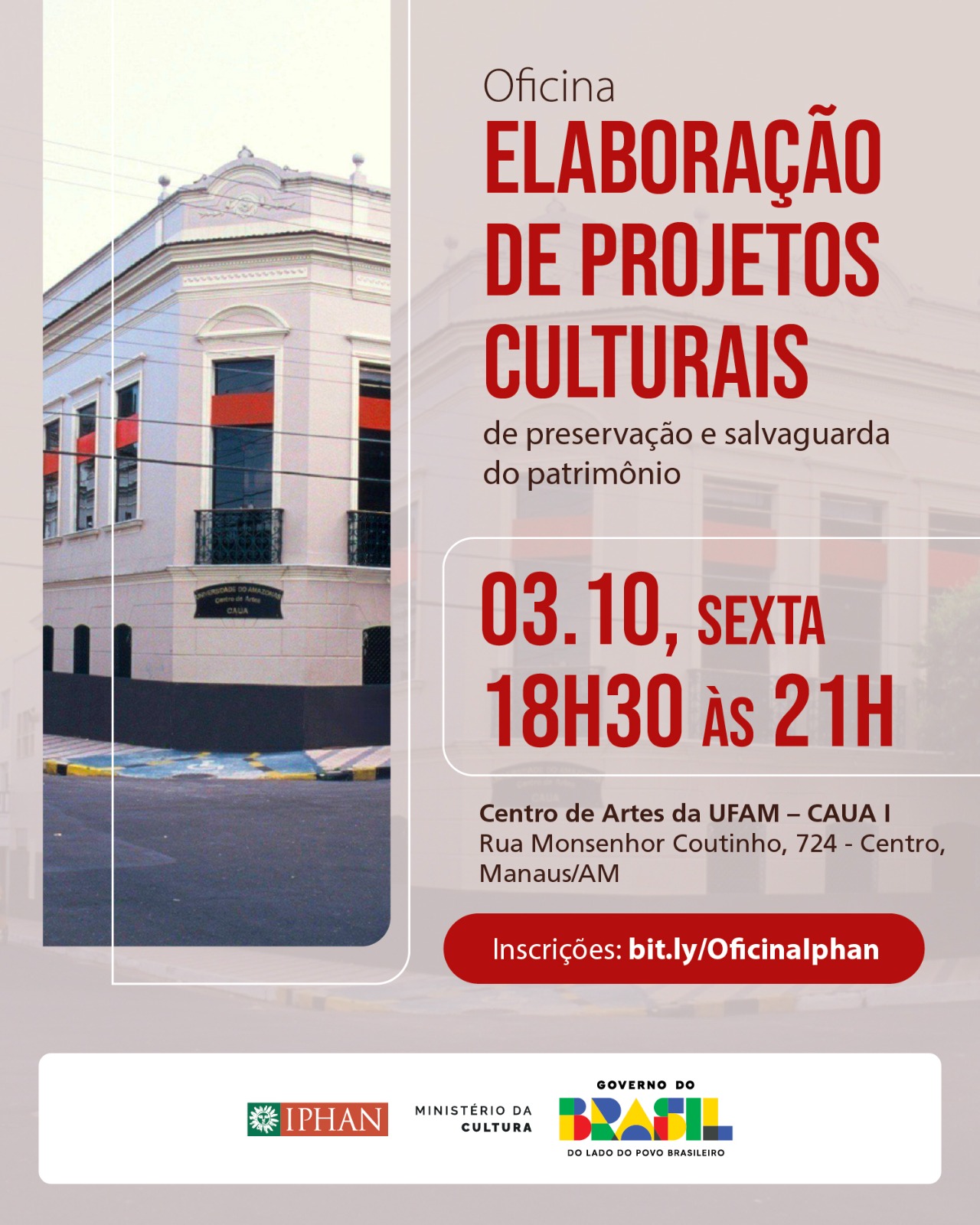 Nos dias 3 e 4 de outubro, Manaus (AM) recebe mais uma Oficina de Elaboração de Projetos Culturais de Preservação e Salvaguarda do Patrimônio, iniciativa do Instituto do Patrimônio Histórico e Artístico Nacional (Iphan) voltada a agentes culturais, educadores, comunidades, produtores e demais trabalhadores do patrimônio cultural. A atividade, aberta ao público, acontecerá no Centro de Artes da Universidade Federal do Amazonas (UFAM), das 18h30 às 21h. As inscrições podem ser feitas através de formulário eletrônico, e os participantes receberão certificação de conclusão.