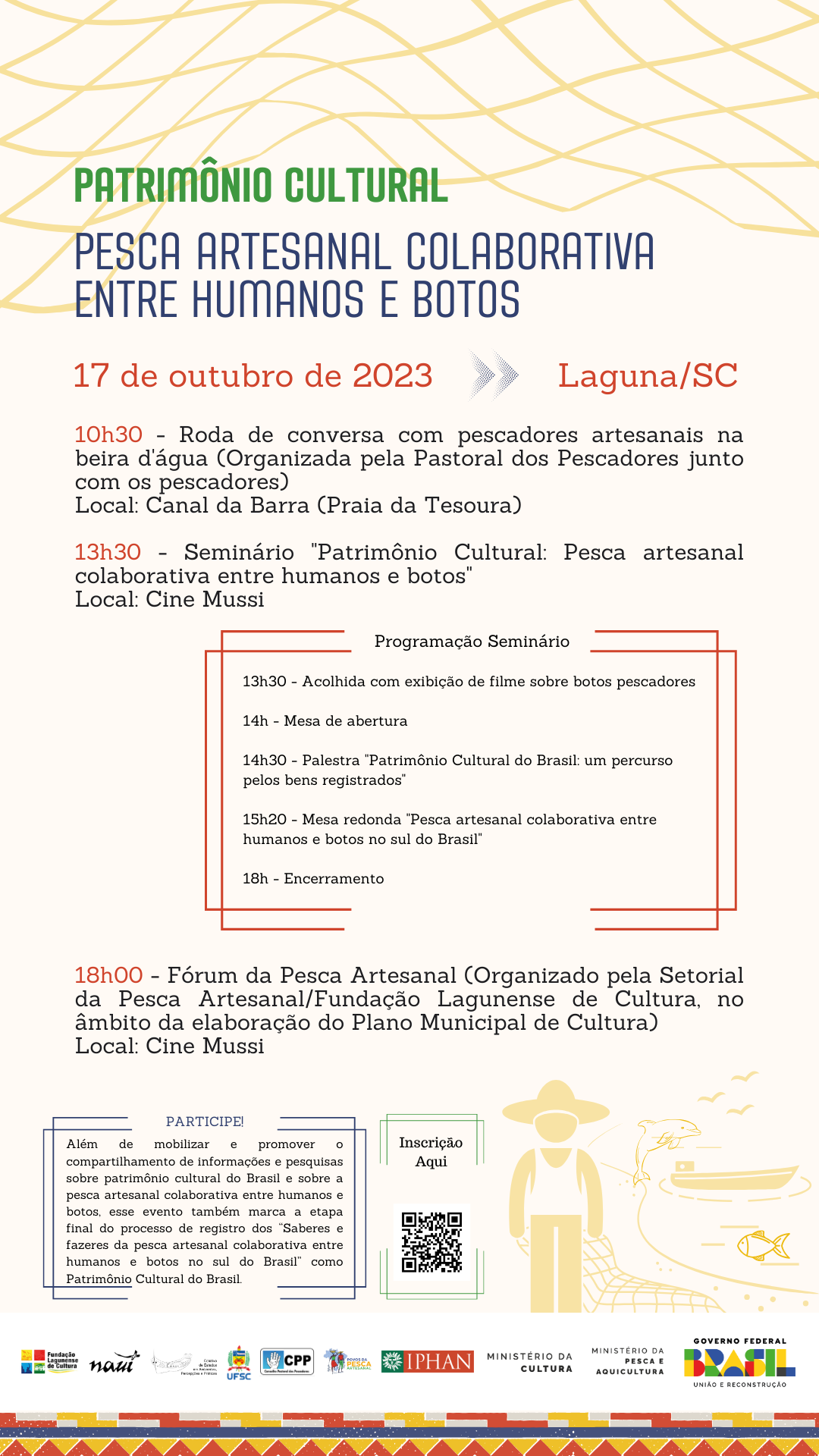 No dia do evento, pela manhã, o presidente do Iphan, Leandro Grass, e o diretor do Departamento de Patrimônio Imaterial (DPI), Deyvesson Gusmão, participarão de uma roda de conversa articulada pela Pastoral dos Pescadores, na Praia da Tesoura, local onde humanos e botos realizam pesca artesanal de forma colaborativa, Patrimônio Imaterial de Laguna e de Santa Catarina.