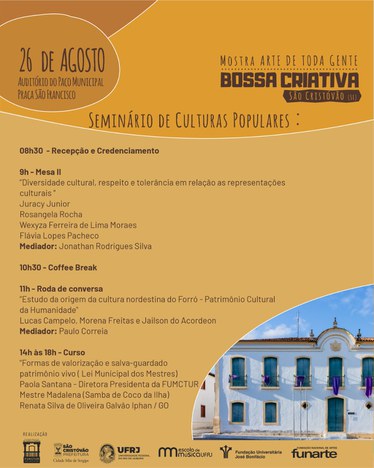 O evento Mostra Arte de Toda Gente – Bossa Criativa em São Cristóvão é gratuito e busca promover os pontos do patrimônio histórico e fortalecer o sentimento de pertencimento a esses lugares. As oficinas serão realizadas no auditório do Paço Municipal, localizado na Praça São Francisco , e as demais atividades serão desenvolvidas na p raça. A programação completa está disponível no site www.bossacriativa.art.br ,