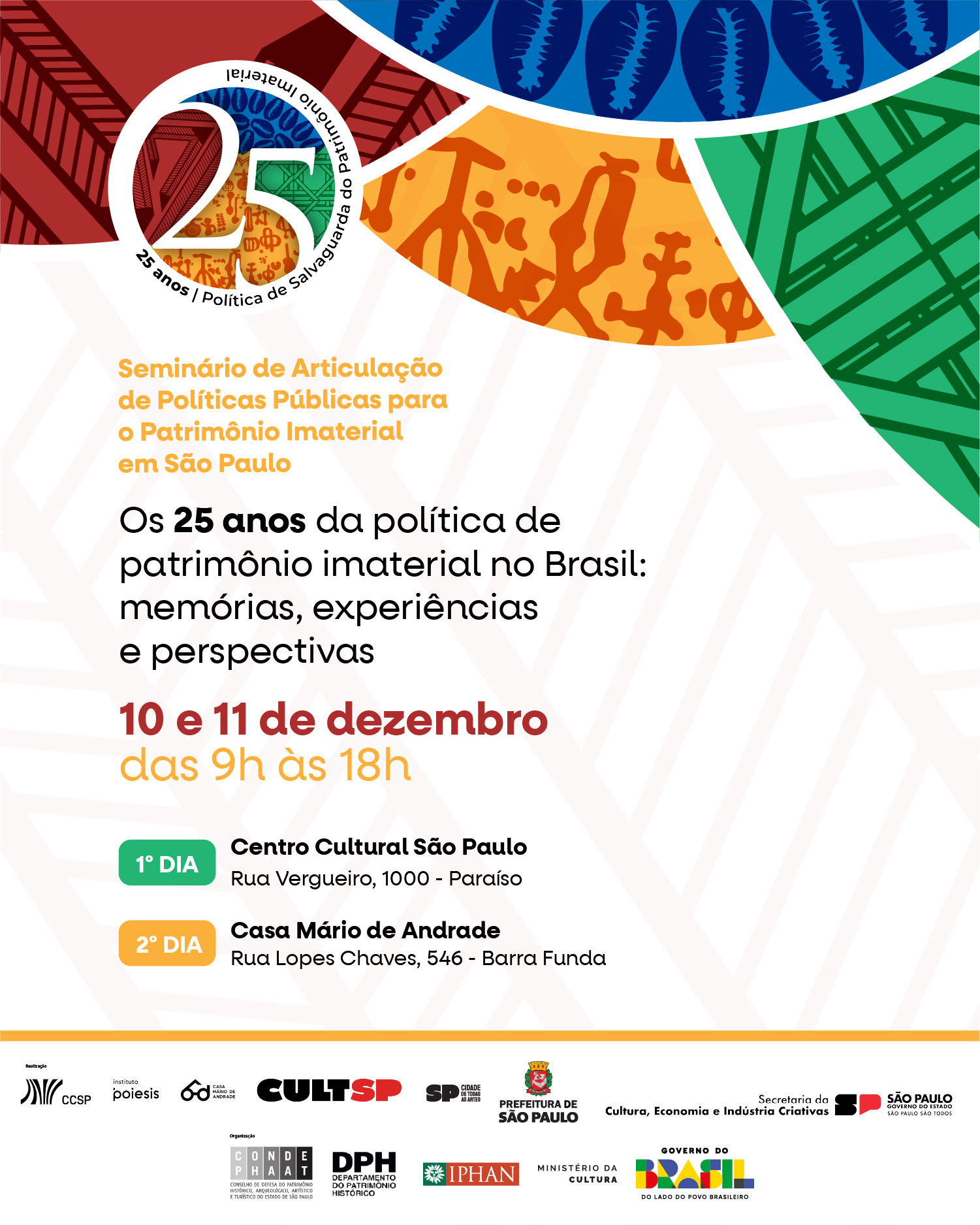Nos dias 10 e 11 de dezembro, das 9h às 18h, a cidade de São Paulo (SP) sedia o Seminário de Articulação de Políticas Públicas para o Patrimônio Imaterial, que neste ano destaca o tema “Os 25 anos da política de patrimônio imaterial no Brasil: memórias, experiências e perspectivas”. O encontro é aberto ao público, com entrada gratuita, e os interessados devem se inscrever por meio de formulário eletrônico disponível aqui.