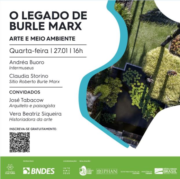 A iniciativa é parte do Programa de Requalificação do Sítio Roberto Burle Marx, realizado com o gerenciamento da Intermuseus e com o patrocínio do Banco Nacional de Desenvolvimento Econômico e Social (BNDES), por meio da Lei de Incentivo à Cultura. A programação do webinário conta com a participação de quatro especialistas: Claudia Storino, Andréa Buoro, José Tabacow e Vera Beatriz Siqueira.