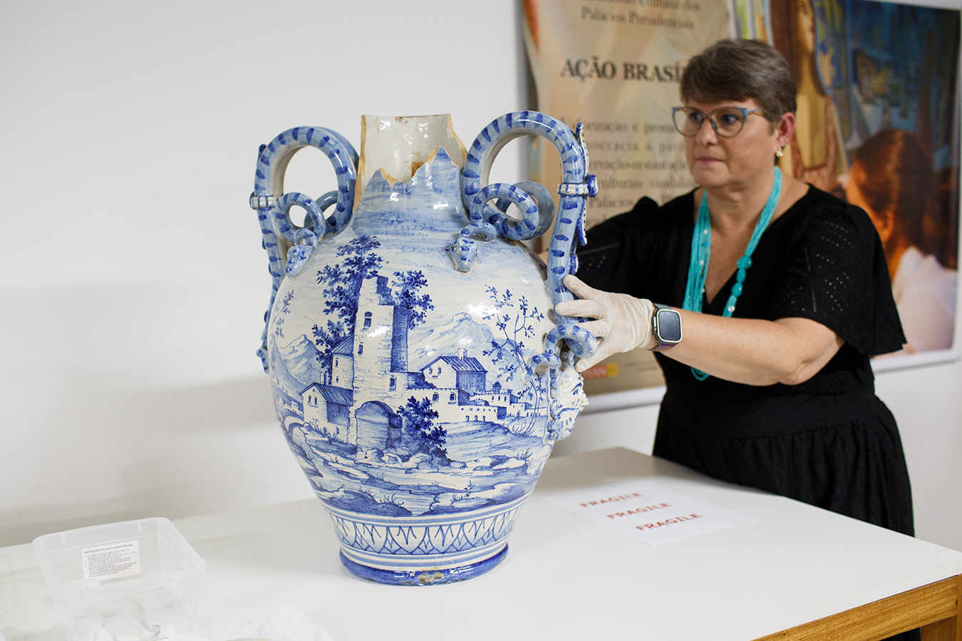 Laboratório de restauração das obras vandalizadas nos ataques de 8 de janeiro de 2023, instalado em parceria entre Iphan, UFPel e Governo Federal. (Foto: Mariana Alves/Iphan)
