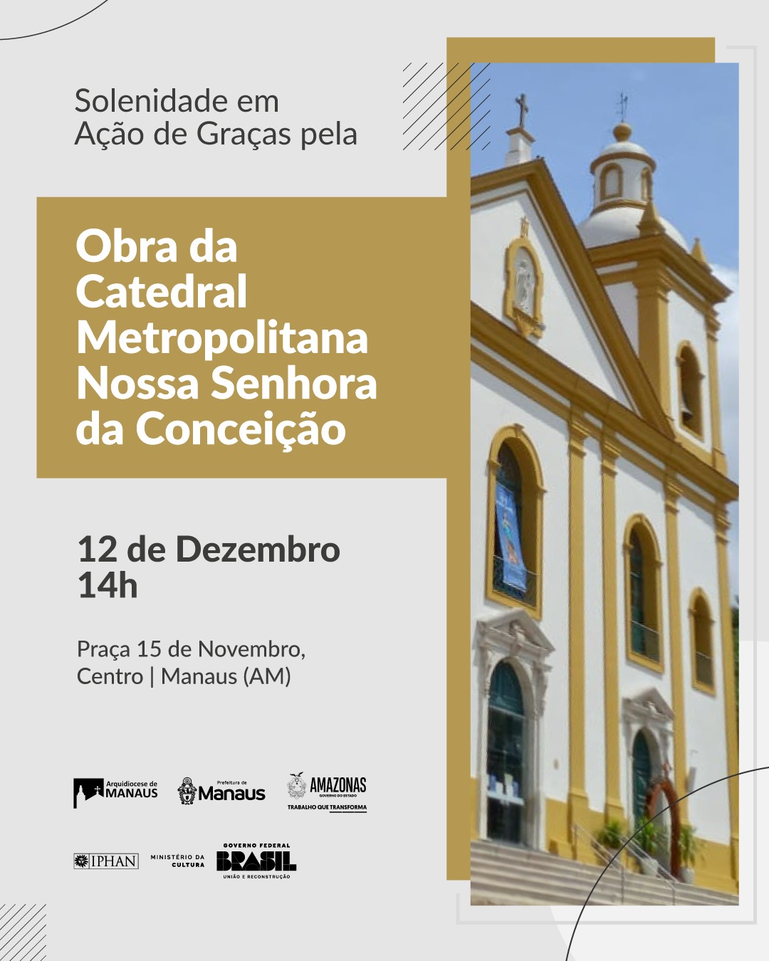 Na próxima sexta-feira (12/12), às 14h, em Manaus, a Solenidade em Ação de Graças pela Obra da Catedral Metropolitana Nossa Senhora da Conceição marcará a entrega da reforma do principal templo católico da cidade, com participação do Instituto do Patrimônio Histórico e Artístico Nacional (Iphan) e investimento de R$ 4,5 milhões.