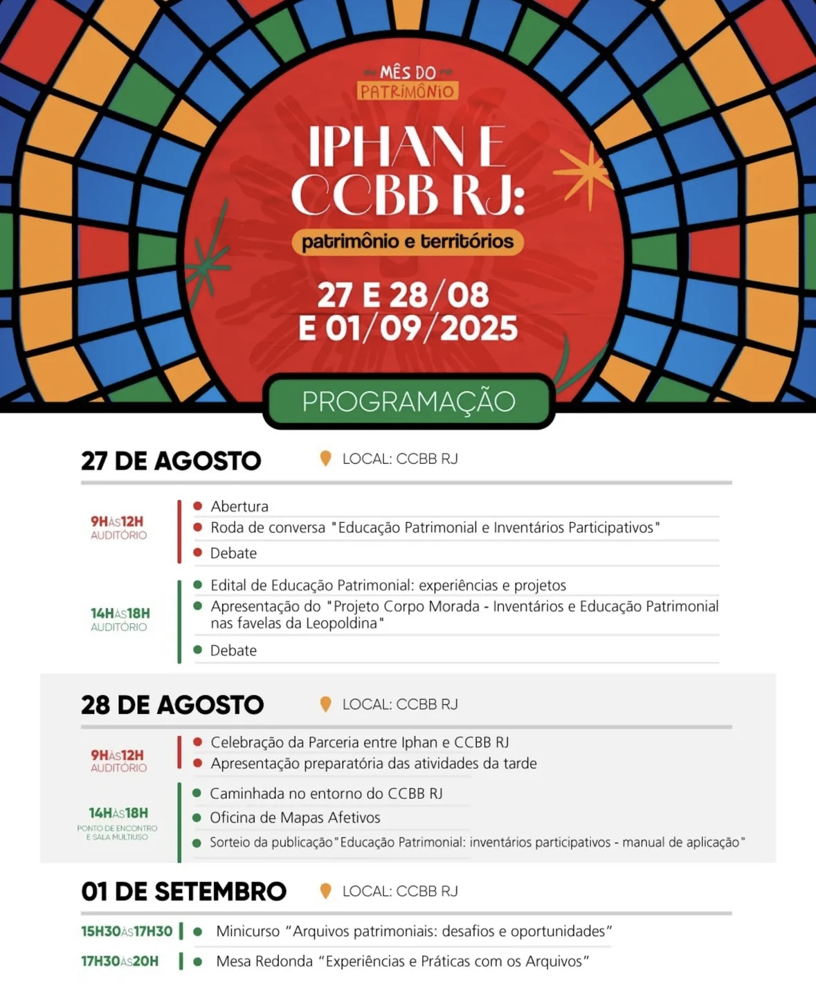 O Instituto do Patrimônio Histórico e Artístico Nacional (Iphan) e o Centro Cultural Banco do Brasil Rio de Janeiro (CCBB RJ) se uniram para promover o evento “Iphan e CCBB: patrimônio e territórios”, com uma programação recheada de atividades de educação patrimonial, na sede carioca do CCBB. Como parte da celebração do Mês do Patrimônio, serão três dias de ações: 27 e 28 de agosto e 1º de setembro de 2025. Todos os eventos são gratuitos mediante retirada de ingresso na bilheteria do CCBB RJ.