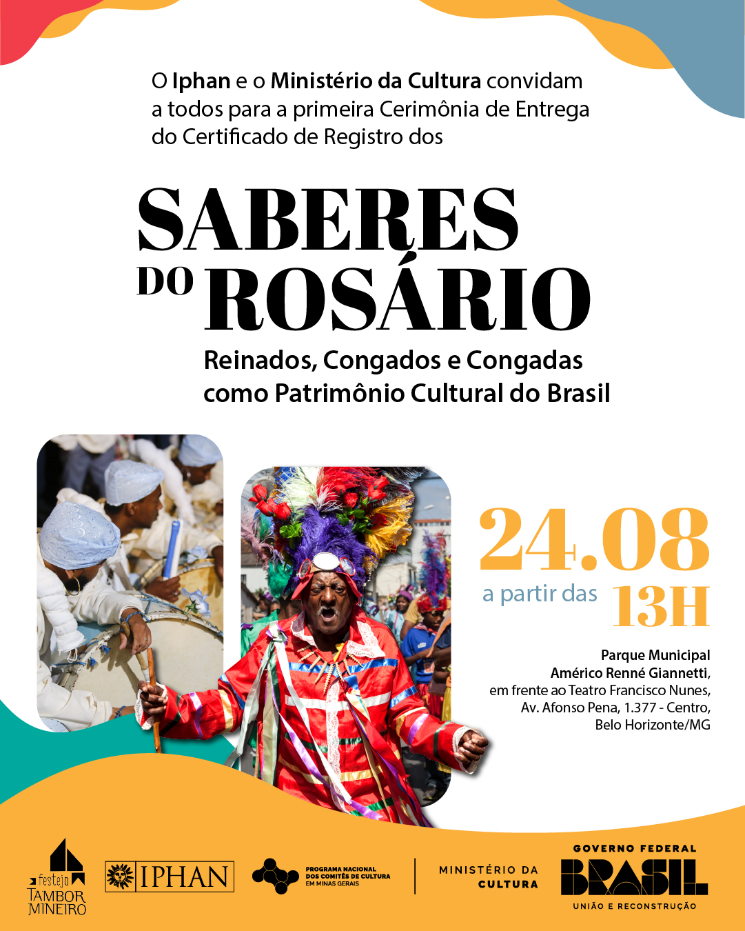 O Instituto do Patrimônio Histórico e Artístico Nacional (Iphan), autarquia federal vinculada ao Ministério da Cultura (MinC), convida a todos para a primeira cerimônia de entrega do Certificado de Registro dos Saberes do Rosário: Reinados, Congados e Congadas, manifestação cultural reconhecida como patrimônio cultural do Brasil pelo Iphan na última reunião do Conselho Consultivo, em junho deste ano. A entrega dos certificados acontecerá no dia 24 de agosto, a partir das 13h, durante a programação do Festejo do Tambor Mineiro e da Virada Cultural de Belo Horizonte, no Parque Municipal Américo Renné Giannetti.