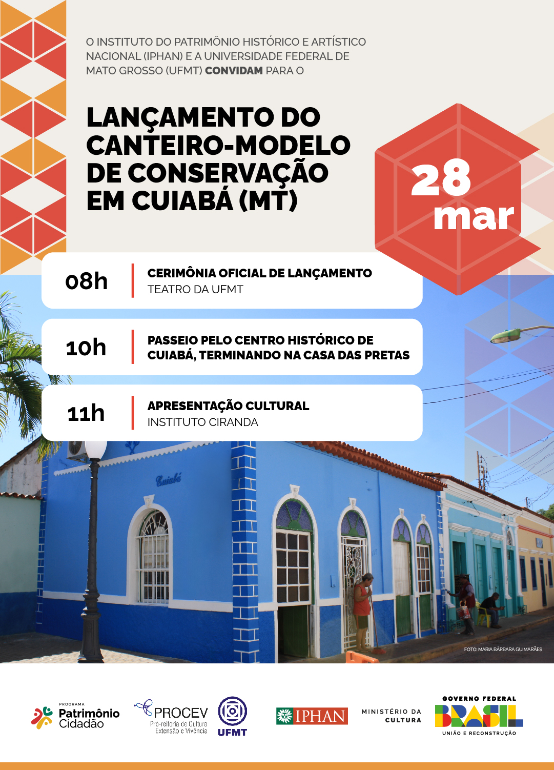 O Instituto do Patrimônio Histórico e Artístico Nacional (Iphan), autarquia vinculada ao Ministério da Cultura (MinC), lança nesta quinta-feira (28/03), às 8h, o Canteiro-Modelo de Conservação de Cuiabá (MT). O projeto dos canteiros-modelo de conservação consiste em oferecer assistência técnica gratuita para moradores com renda familiar de até 3 salários mínimos, que vivem em áreas tombadas de cidades históricas, como é o caso da capital mato-grossense.