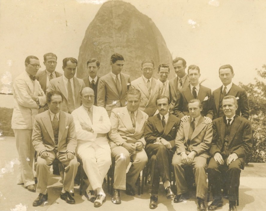 Lucio Costa sentado entre Gregori Warchavchik (terceiro da esquerda para a direita na primeira fila) e de Cândido Portinari, durante almoço oferecido a Gregori Warchavchik, no Morro da Urca. Entre os demais, os arquitetos: Celso Antônio, Alcides da Rocha Miranda, Carlos Leão, Cícero Dias.