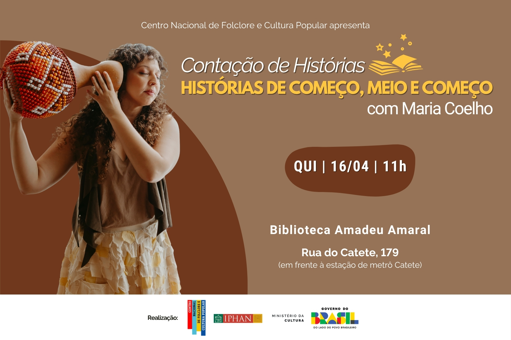 O Centro Nacional de Folclore e Cultura Popular (CNFCP) realiza, nesta quinta-feira, 16 de abril, às 11h, mais uma contação de histórias na Biblioteca Amadeu Amaral. Desta vez, a atividade será com a artista Maria Coelho, que apresenta Histórias de começo, meio e começo, um convite para refletir sobre os ciclos da vida a partir de narrativas tradicionais. A entrada é gratuita, e não há necessidade de inscrição prévia.
