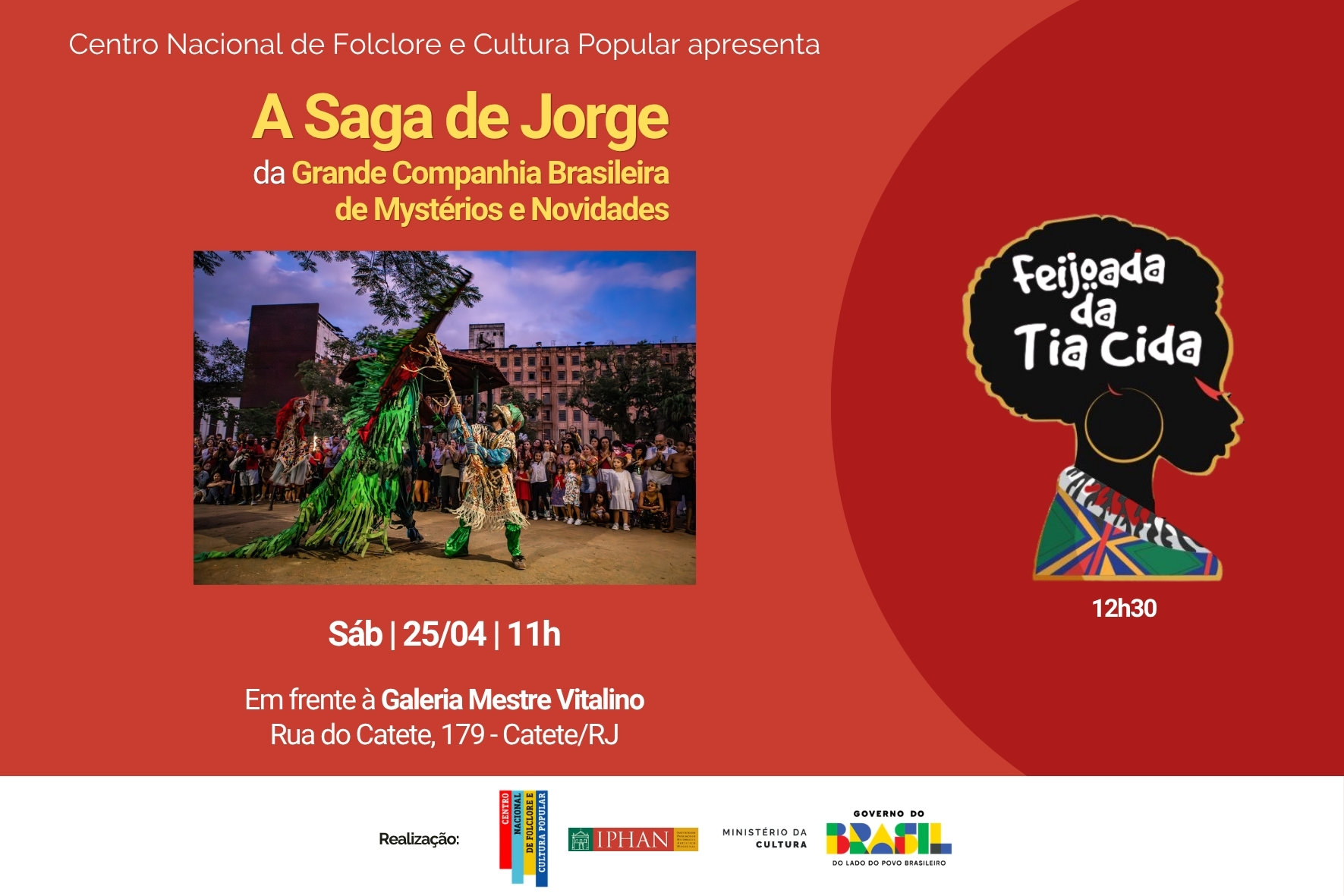O Centro Nacional de Folclore e Cultura Popular, unidade especial do Instituto de Patrimônio Histórico e Artístico Nacional (CNFCP/Iphan), promove, no dia 25 de abril, sábado, uma celebração especial em homenagem ao Dia de São Jorge (23 de abril). A partir das 11h, o público poderá acompanhar o espetáculo A Saga de Jorge, da Grande Companhia Brasileira de Mystérios e Novidades. A entrada é gratuita. Na sequência, a partir das 12h30, estará à venda a Feijoada da Tia Cida, preparada pelo Quilombo Ferreira Diniz, localizado no bairro da Glória.