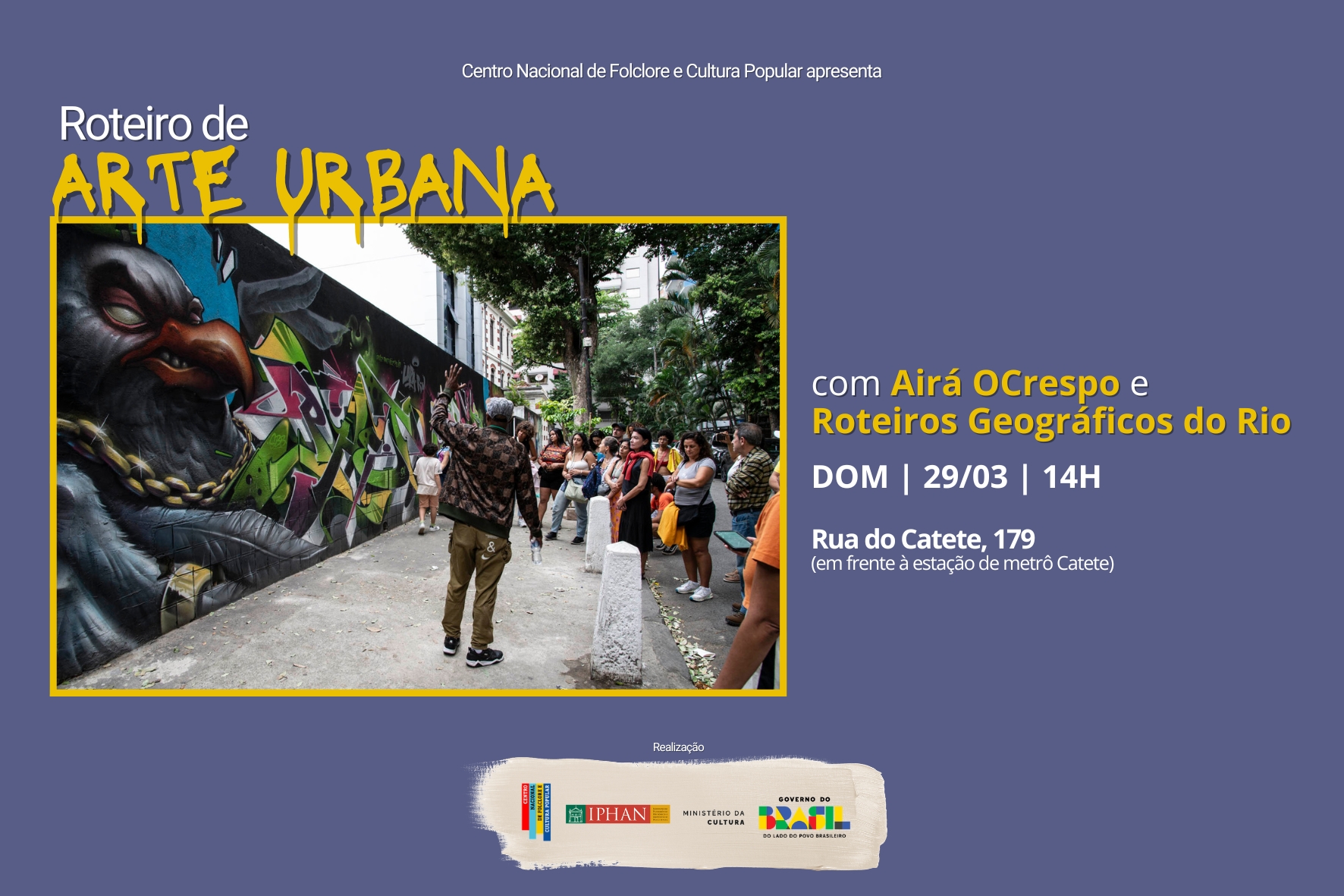 Conduzido pelo artista Airá Ocrespo e pelos professores do Projeto Roteiros Geográficos do Rio, o percurso convida o público a observar a cidade a partir de suas intervenções visuais — grafites, murais e pichações — compreendidas como formas de expressão no espaço público.