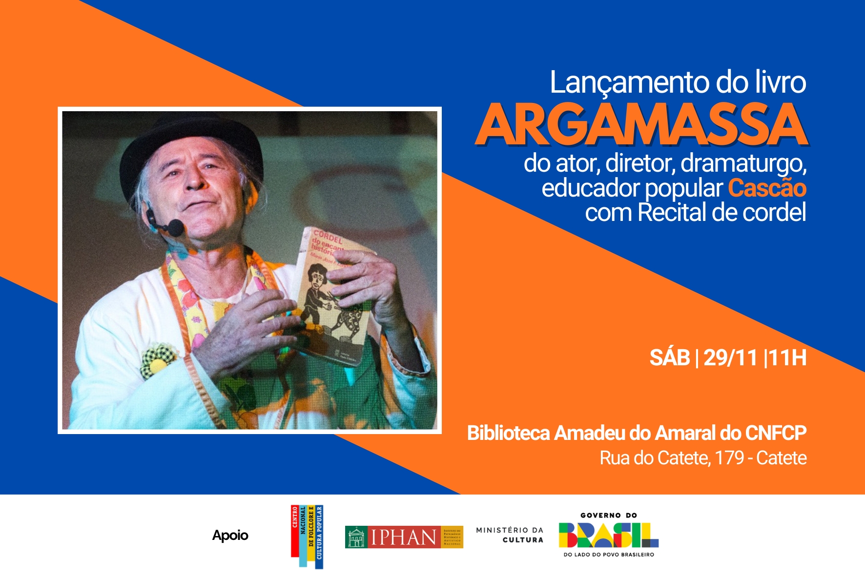 O Centro Nacional de Folclore e Cultura Popular (CNFCP) recebe no próximo sábado, 29 de novembro, às 11h, o lançamento do livro Argamassa, do ator, diretor, dramaturgo, educador popular Cascão (Rodolfo Alexandre Cascão Inacio). O evento gratuito acontece na Biblioteca Amadeu Amaral do CNFCP, na Rua do Catete, 179, e é aberto ao público.