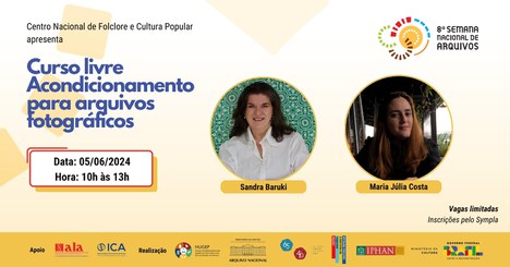 O Centro Nacional de Folclore e Cultura Popular (CNFCP/Iphan) realizará, no próximo dia 5 de junho, o curso livre Acondicionamento para arquivos fotográficos, como parte da programação da Semana Nacional de Arquivos 2024, promovida pelo Arquivo Nacional. O curso será ministrado das 10h às 13h, na Galeria do 3º andar do CNFCP, pelas professoras Sandra Baruki e Maria Júlia Costa, conservadoras-restauradoras de Fotografia.