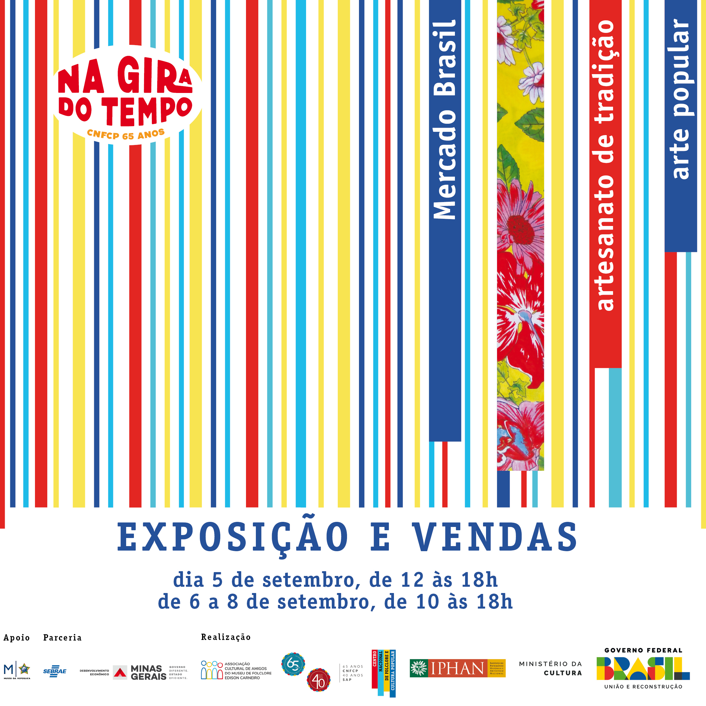 O Mercado Brasil de Artesanato Tradicional está entre as atividades comemorativas do Encontro Na Gira do Tempo: 65 anos do Centro Nacional de Folclore e Cultura Popular(CNFCP/Iphan). O evento trará 65 comunidades e artistas que produzem objetos de decoração, vestuário, utilitários e acessórios para mostra e venda no Jardim do Museu da República, no período de 05 a 08 de setembro.