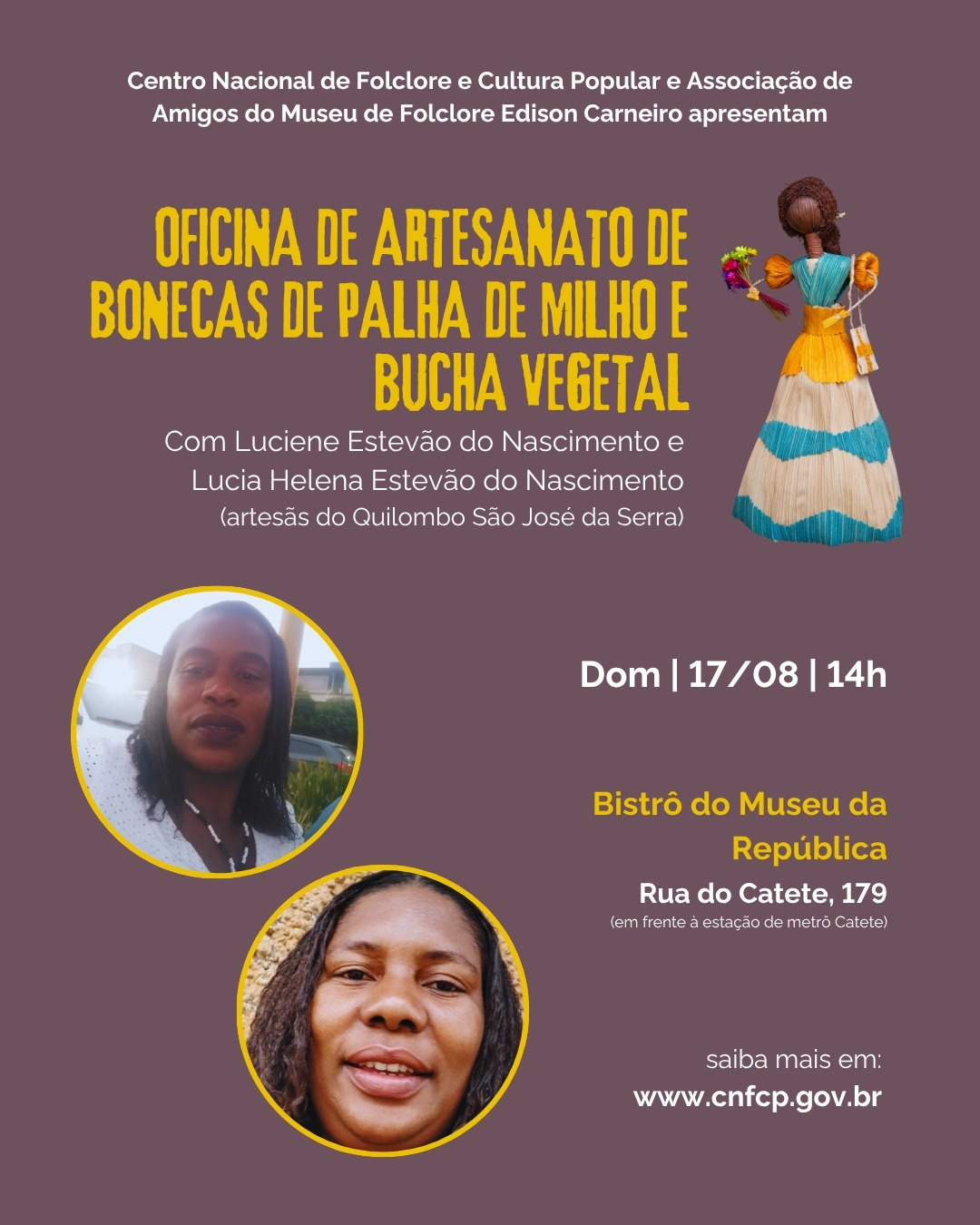 A Oficina de Bonecas de Palha de Milho e Bucha Vegetal, conduzida pelas artesãs Luciene Estevão do Nascimento e Lucia Helena Estevão do Nascimento, do Quilombo São José da Serra (Valença/RJ), ganhou uma nova data e um significado especial. Agora, a atividade será realizada no dia 17 de agosto, domingo, às 14h, no Bistrô do Museu da República, localizado atrás da gruta nos jardins (Rua do Catete, 153 – Catete, Rio de Janeiro/RJ).