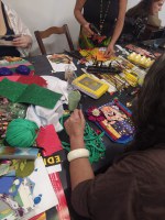 Banners, cartilhas, cartazes, CDs, postais foram disponibilizados pelo CNFCP para serem compartilhados, assim como materiais trazidos pelo pessoal que participou. A experimentação de uma variedade de recicláveis fez ideias incríveis surgirem, sob a orientação tranquila e bem humorada do artista, que tem inspiração em suas raízes mineiras. A novidade foi o sorteio, em cada oficina, de uma peça produzida por Willi de Carvalho. Alegria para as ganhadoras!