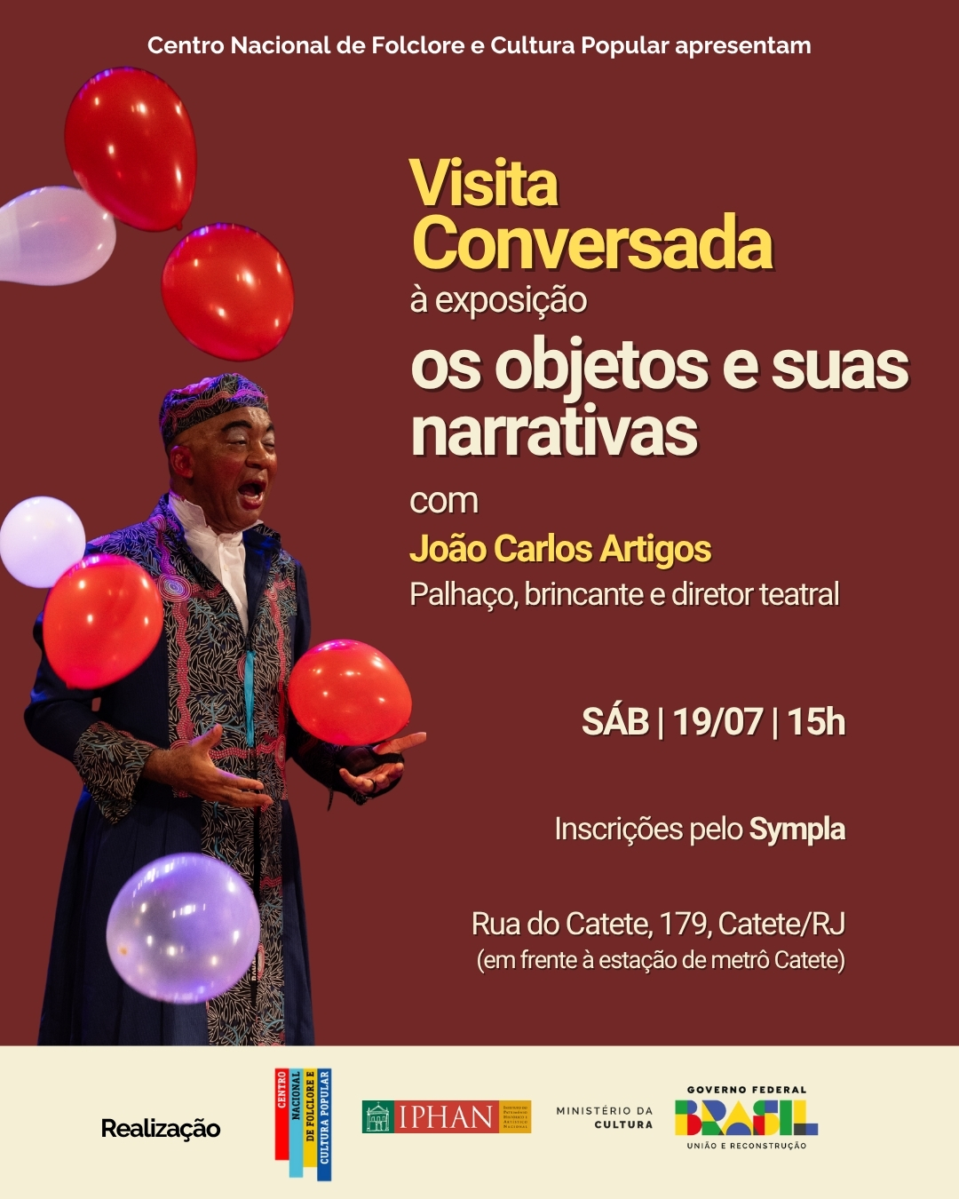No dia 19 de julho, às 15h, o Centro Nacional de Folclore e Cultura Popular (CNFCP/Iphan) promove mais uma edição da Visita Conversada à exposição de longa duração Os objetos e suas narrativas, desta vez com a presença do palhaço, brincante e diretor teatral João Carlos Artigos. A proposta da atividade é mergulhar nos conteúdos da cultura popular brasileira sob a ótica criativa e provocadora do convidado, oferecendo ao público novas perspectivas e leituras sobre os objetos e a narrativa da exposição.
