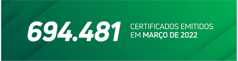 Pelo 22º mês consecutivo, o número de emissões de Certificados Digitais no padrão da Infraestrutura de Chaves Públicas Brasileira (ICP-Brasil), apresenta recorde. O mês de março fechou com 694.481 novos certificados emitidos, resultado 15,2% maior ante o mesmo período de 2021.