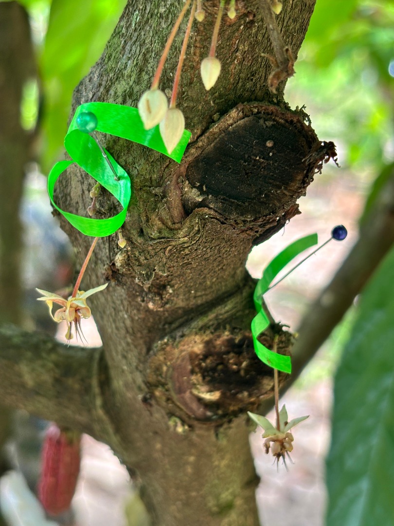 “Neste ano, realizamos testes de polinização natural, que servem como grupo controle, além da polinização cruzada e da geitonogamia. Também testamos a autopolinização induzida e espontânea. Para isso, isolamos as flores para evitar interferências externas. Esses testes nos orientam na avaliação do sucesso reprodutivo das plantas cacaueiras, sejam elas híbridas ou clonais”, explica Rosinaira Gonzaga.