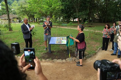 Antes disso, também ao lado do presidente do JBRJ, Eliezer de Sousa Nunes, Rita Mesquita descerrou a nova placa em homenagem a Chico Mendes, reinaugurando o espaço que leva o nome do líder seringueiro e ambiental. A paisagista Ana Rosa de Oliveira e a diretora de Operações do JBRJ, Marcia Faraco, falaram sobre a concepção e revitalização do espaço, inaugurado há 20 anos pela ministra Marina Silva em sua primeira gestão. O Espaço Chico Mendes fica próximo ao Roseiral.