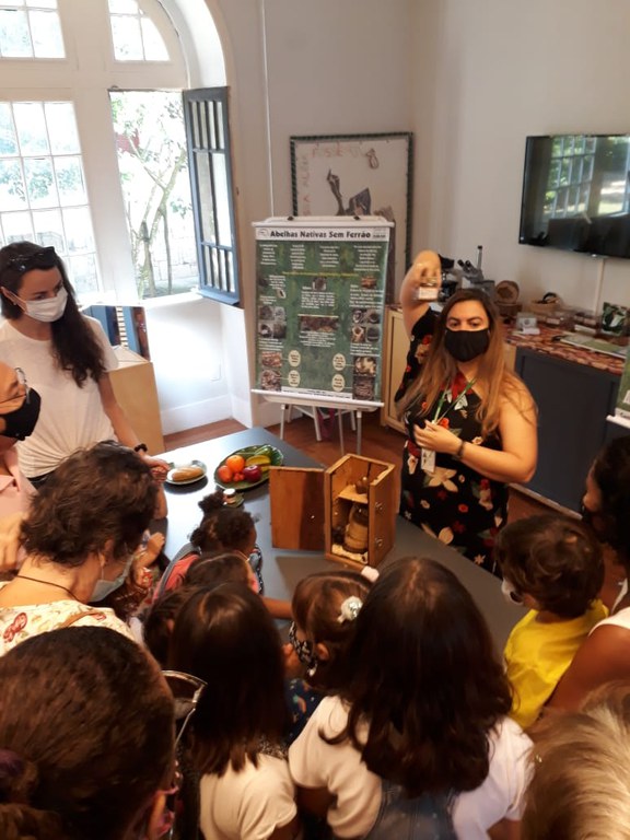 Depois das atividades no museu, as crianças caminharam até o meliponario, reaberto à visitação pública no último dia 20, que conta com 17 colmeias referentes a nove espécies de abelhas sem ferrão, nativas da Mata Atlântica da Região Sudeste. Lá, a responsável pelo Laboratório de Fitossanidade do JBRJ, Maria Lucia Teixeira Moscatelli, mostrou às crianças a ação das abelhas sem ferrão.