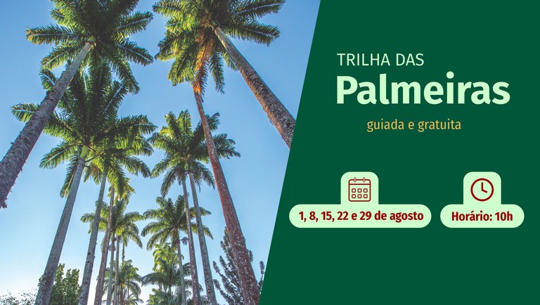 A Trilha das Palmeiras será oferecida nos dias 1º, 8, 15, 22 e 29 de agosto. As saídas são às 10h do Centro de Visitantes. Não é necessário agendamento prévio, basta chegar e participar. O passeio guiado é gratuito. Há apenas cobrança de ingresso para o arboreto.