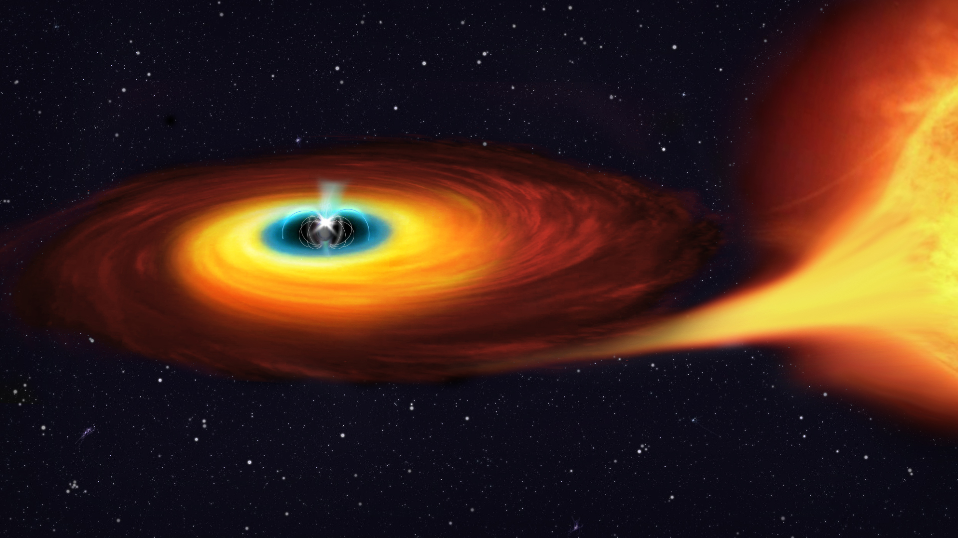 Concepção artística de um sistema de tipo polar intermediária, com uma anã branca capturando matéria de sua companheira.