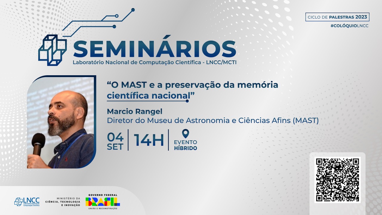 Na próxima segunda-feira (04), às 14h, o diretor do Museu de Astronomia e Ciências Afins (MAST), Marcio Rangel, é o convidado do Colóquio do Laboratório Nacional de Computação Científica - LNCC, apresentando a palestra: "O MAST e a preservação da memória científica nacional". Assim como nas edições anteriores o evento é aberto ao público acadêmico e à sociedade em geral.